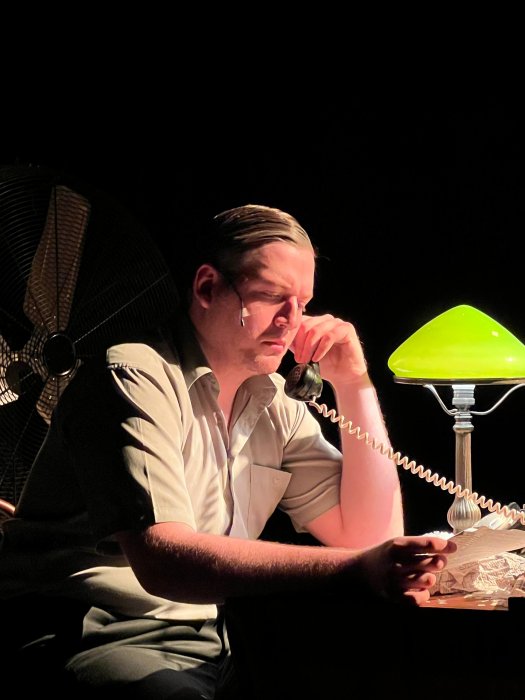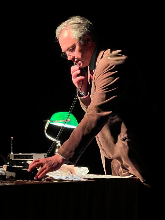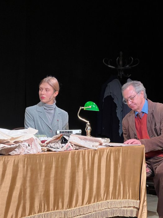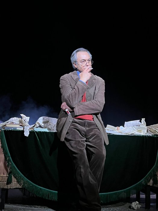 В своем неизменном пиджаке, в вельветовых брюках с пачкой сигарет в руке. Даже не курит, просто достает сигарету и ломает, закуривает и гасит. Нервно ходит, то садится, то встает у стола, который и есть та самая лента жизни с ворохом бумаг – писем, книг, газет, доносов, статей, стихов, которые в финале сдует вихрем то ли снежным, то ли Времени. Огромный ветродуй, не скрыт декорациями, он тоже один из участников спектакля, то ли вентилятор, то ли деталь самолета. Он снесет с длинного, стоящего почти вдоль всего пространства сцены стола всё, словно это дым и сон, и не было никакого абсурда в жизни, а был только высокий накал чувства и высокий строй мысли. Ради которых всё и было задумано свыше.